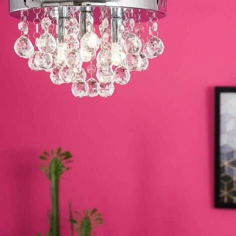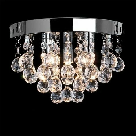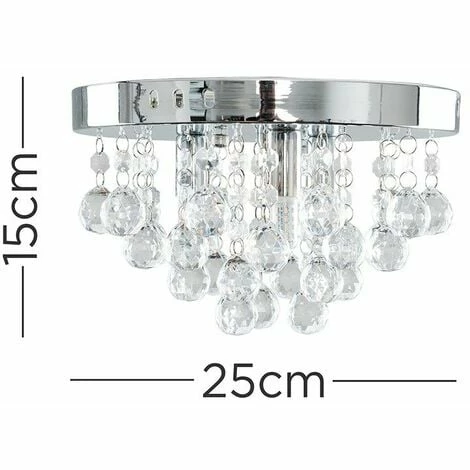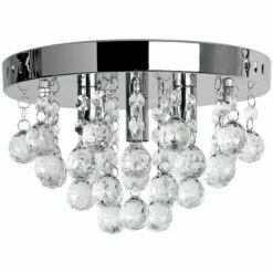 This stylish flush 3 way ceiling light fitting comes in a polished chrome finish with beautiful cascading clear acrylic jewel droplets. This sleek ceiling fitting is a great way to add a touch of glamour to any room in your home. The jewels droplets glisten and sparkle when the light is switched on reflecting light around the room. Ideal for lounges dining rooms bedrooms and other living areas.