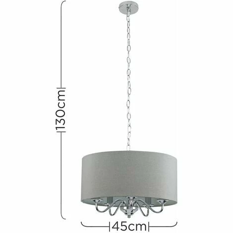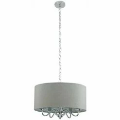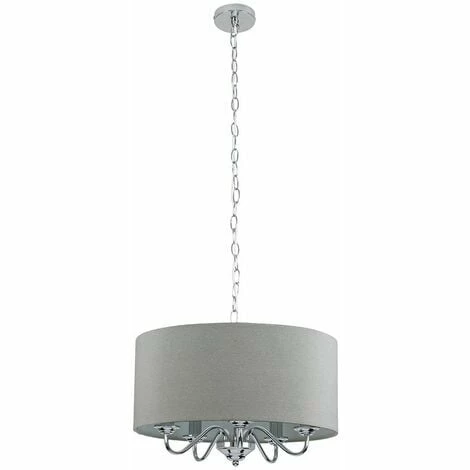 Modern 5 way curved arm suspended chain ceiling light pendant fitting in a chrome metal finish featuring a stunning grey slimline drum shade which shades the light to create an ambient glow within the room. This ceiling light is perfect for adding a statement piece to your home and is ideal for living rooms bedrooms and other areas.