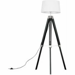 Modern tripod style floor lamp in a black wood effect and silver chrome finish which features an in-line on/off switch for easy use. a tapered shade in a white faux linen fabric finish. Floor lamps are a great way to bring additional lighting to a room or you can use them reduce your main light output and create a more relaxing mood/atmosphere.