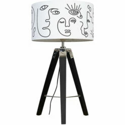 This MiniSun tripod table lamp comes in a black wood and chrome finish. Complete with a fabric drum shade with a modern abstract face design and an in line on/off switch for easy use. Perfect for adding a modern style to any room in your home.