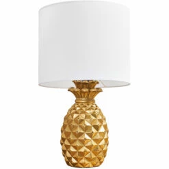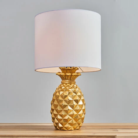 Contemporary pineapple design table lamp in a gold effect finish complete with a white fabric drum lamp shade. This unique lamp will look great in any interior space. Its quirky design is a great alternative to a traditional table lamp. Ideal for lounges hallways bedrooms and other living areas.
