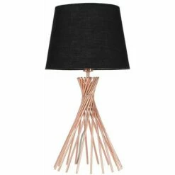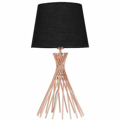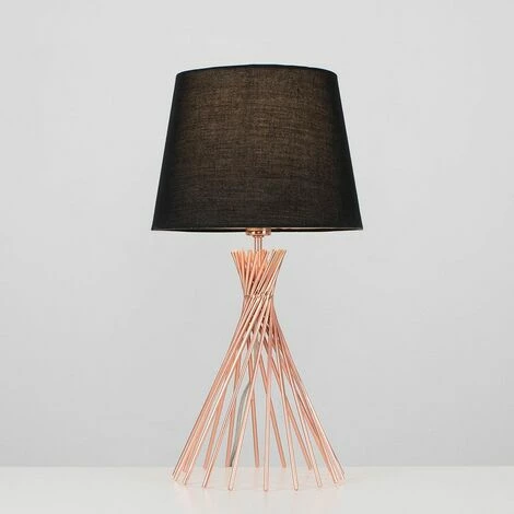 Modern twisted metal wire design table lamp in a copper effect finish complete with a black polycotton tapered light shade. Features an in-line on/off switch for easy use. Table lamps are a great way to bring additional lighting to a room or you can use them reduce your main light output and create a more relaxing mood/atmosphere.