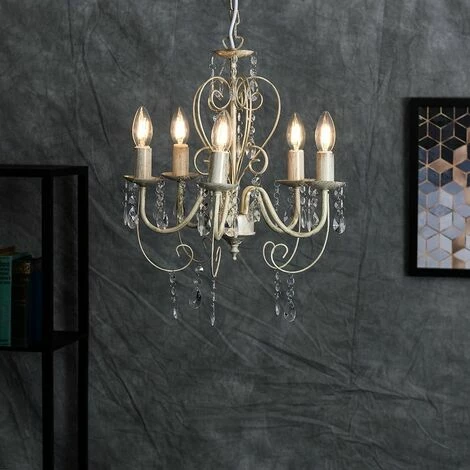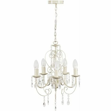 This is an elegant traditional vintage chandelier. This French influenced 5 way ceiling fitting is adorned with acrylic droplets. This stunning chandelier looks great and adds to any hallway or dining room. It comes in an astonishing distressed white finish. 5 x 4w LED SES E14 Energy Saving Frosted Opal Glass Warm White Candle Bulbs Supplied
