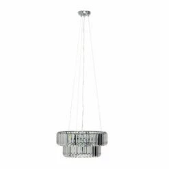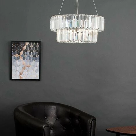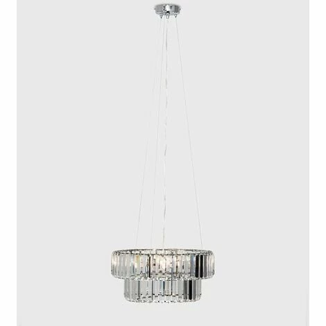 This stunning and elegant 5 way polished chrome designer ceiling light is perfect for hallways dining rooms lounges living rooms and bedrooms. It features an eye catching tiered crystal border design which glisten and reflect the light to create an ambient glow around the room guaranteed to make a statement in any living area. Ceiling lights are usually the main source of illuminating a room but with the many styles on offer today also become a main focal point or talking point.