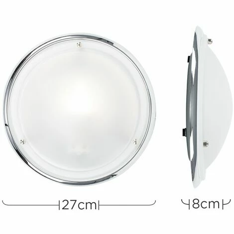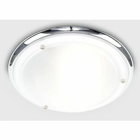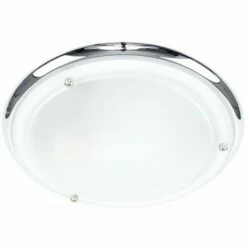 This modern yet traditionally styled round bathroom light is a great way to add a touch of sophistication to any bathroom. The flush fitting means that this light is unobtrusive whilst still emitting a clean and crisp light. Finished in a brilliant polished chrome finish with a frosted white glass shade this light is sure to improve your bathroom. This product is IP44 rated and can be used in zones 12 and 3 in a bathroom. The ideal bulb to be used with this product is a 60w ES GLS bulb – not supplied.