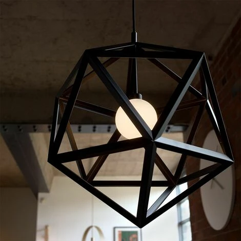 This MiniSun ceiling pendant light fitting is a great addition to any room. Featuring a design inspired by geometric patterns in a black metal finish with a frosted globe shade. Ideal for any type of space no matter the interior.