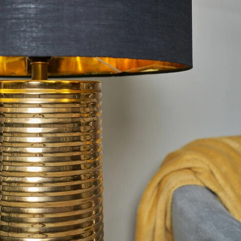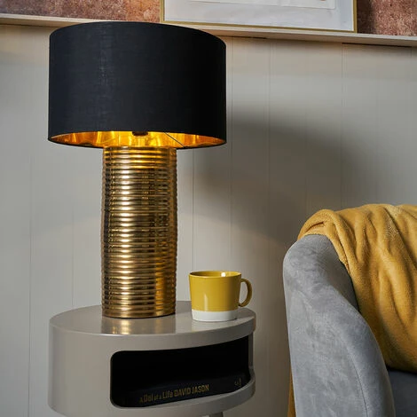This MiniSun table lamp features a combed cylinder base in a gold metal finish. Complete with an in-Line on/off rocker switch for easy use and a large lampshade. Ideal for living rooms bedrooms hallways and other living areas.