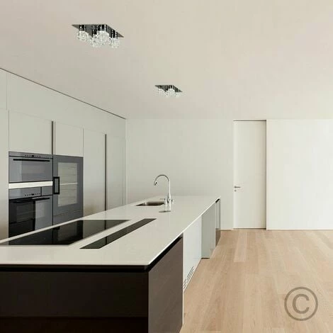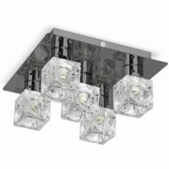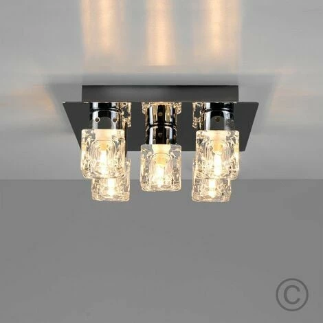 The right fitting can make a real style statement and complete your living space look. Stunning modern flush 5 way halogen ceiling light. Black chrome finish with glass ice cube shades. The glass shades cast a subtle beautiful light across the room once lit.