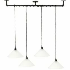 Vintage and industrial style satin black 4 way pipework wrap over ceiling light. This unique light comes complete with tapered shades in a white frosted glass finish which will make a real style statement and complete your living space look. Ideal for dining rooms kitchens and other living areas.