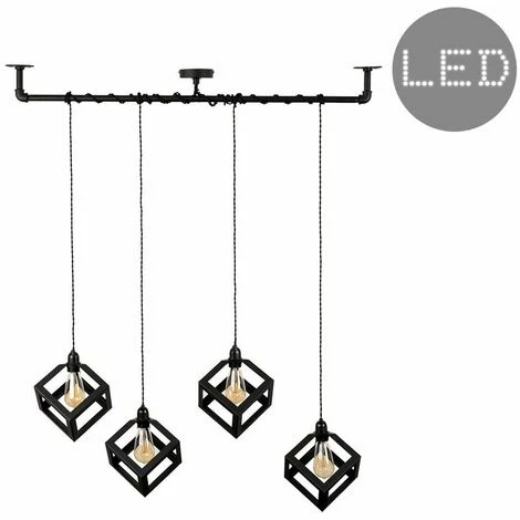 Vintage and industrial style satin black 4 way pipework wrap over ceiling light. This unique light comes complete with puzzle cube design shades in a black metal finish which will make a real style statement and complete your living space look. Ideal for dining rooms kitchens and other living areas.