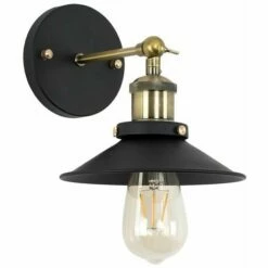 Vintage and industrial style wall light fitting in a contrasting black and antique brass effect metal finish with a tapered shaped light shade. This unique light will make a real style statement and complete your living space look. Ideal for dining rooms kitchens and other living areas.