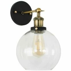 Vintage and industrial style wall light fitting in a contrasting black and gold effect metal finish with a drop down amber tinted clear glass globe shaped light shade. This unique light will make a real style statement and complete your living space look. Ideal for dining rooms kitchens and other living areas.