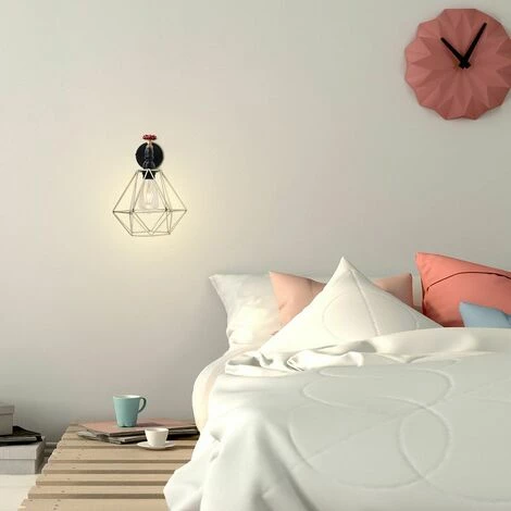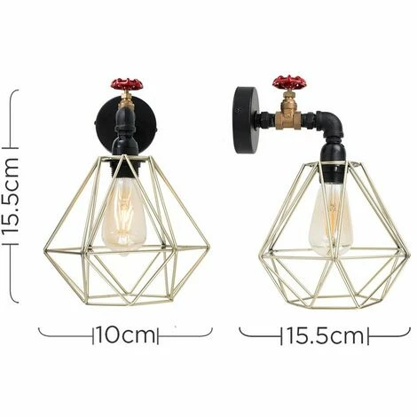 Vintage and industrial style pipework wall light fitting in a satin black and antique brass metal finish which features a fixed red tap. Complete with a retro style gold metal basket cage shade. This unique light will make a real style statement and complete your living space look. Ideal for dining rooms kitchens and other living areas.
