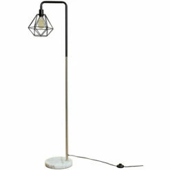 Retro style metal rod frame floor lamp in a matt black and chrome finish with a white solid marble base. This lamp is constructed from high quality materials and the marble base makes this lamp extremely sturdy. This contemporary floor lamp is guaranteed to make a statement in any home. Complete with a gloss black metal cage shade which features an open design which allows the light to disperse effectively and evenly throughout the room.