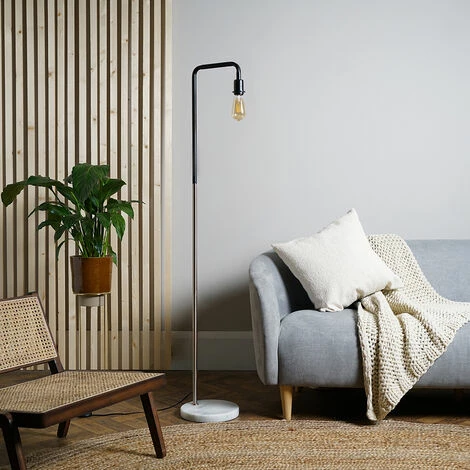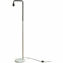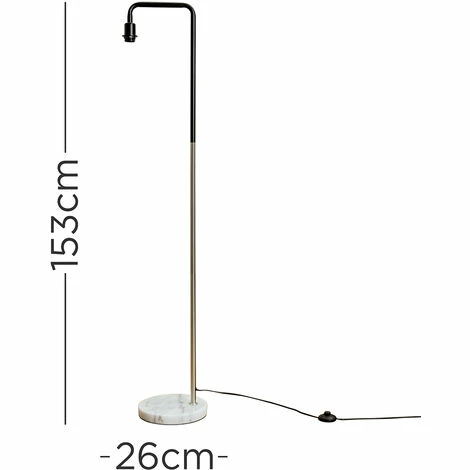 Retro style metal rod frame floor lamp in a matt black and gold effect finish with a white solid marble base. This lamp is constructed from high quality materials and the marble base makes this lamp extremely sturdy. This contemporary floor lamp is guaranteed to make a statement in any home. A squirrel cage bulb is recommended with this lamp.
