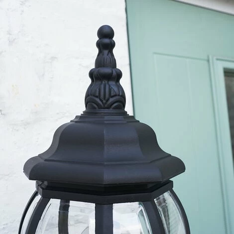 Beautiful traditional style outdoor wall light made from durable weather resistant resin. Features clear shade panels with bevelled edge detail. An ideal product to help create a warm and inviting glow to doorways porches and external walls. IP44 Rated. Please note this bulb is NOT dimmable.