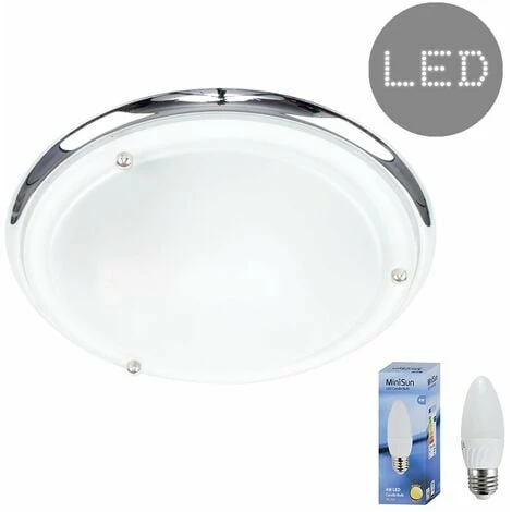 This modern yet traditionally styled round bathroom light is a great way to add a touch of sophistication to any bathroom. The flush fitting means that this light is unobtrusive whilst still emitting a clean and crisp light. Finished in a brilliant polished chrome finish with a frosted white glass shade this light is sure to improve your bathroom. This product is IP44 rated and can be used in zones 12 and 3 in a bathroom. Thermal Plastic 4w High Power LED ES E27 Warm White Candle Bulb Supplied