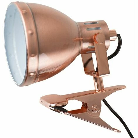 Retro style domed shaped clip on spotlight in a satin copper effect metal finish. The clamp is ideal for clipping onto hard surfaces for reading writing and other tasks. Adjustable spotlight head direct the light where it is required. Also features an in-line on/off switch for easy use.
