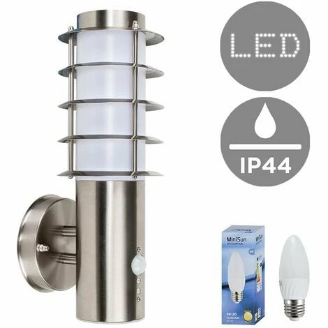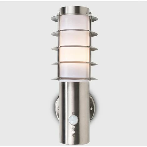 Modern outdoor wall lantern in a stainless steel finish. Features a contemporary design with a frosted white inner shade. Features contemporary design and high-quality weatherproof construction with a built in PIR motion sensor. An ideal product to help create a warm and inviting glow to doorways porches and external walls. IP44 rated – fully certified for outdoor installation.