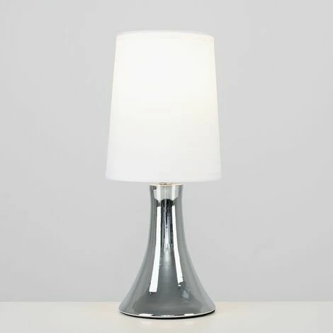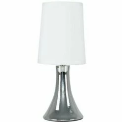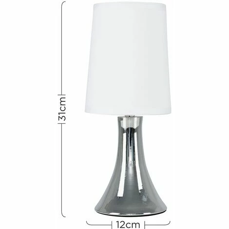 This fantastic touch table lamp with a stunning curved polished chrome base is a wonderful addition to any contemporary home. The white fabric shade allows the light to be dispersed evenly throughout the room. Simply touch the metal base to turn it on. The light can be set to 4 stages off a low level light for mood lighting a medium level light for general lighting and a high level light which is the brightest setting to create an intense pool of light.
