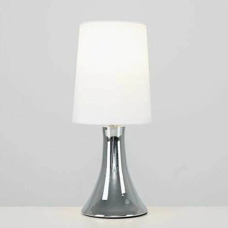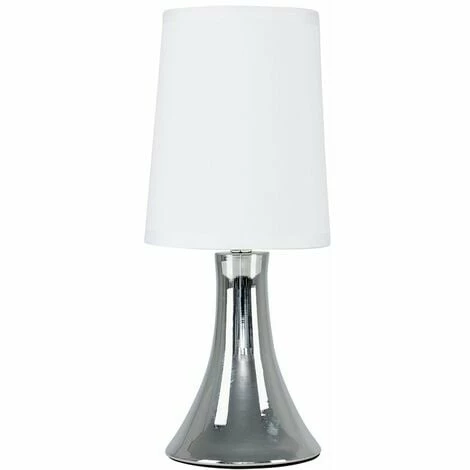 This fantastic touch table lamp with a stunning curved polished chrome base is a wonderful addition to any contemporary home. The white fabric shade allows the light to be dispersed evenly throughout the room. Simply touch the metal base to turn it on. The light can be set to 4 stages off a low level light for mood lighting a medium level light for general lighting and a high level light which is the brightest setting to create an intense pool of light. The ideal bulb for this product is a 40w SES candle bulb – not supplied. Please Note This lamp requires dimmable bulbs. Not suitable for standard LED or energy saving bulbs.