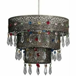 Moroccan style 3 tier ceiling pendant light shade in a distressed effect metal finish which features intricate patterns and details and multi-coloured acrylic crystal jewel droplets. Ideal for lounges dining rooms bedrooms and hallways. Easily fits to your standard ceiling light socket – no wiring required!