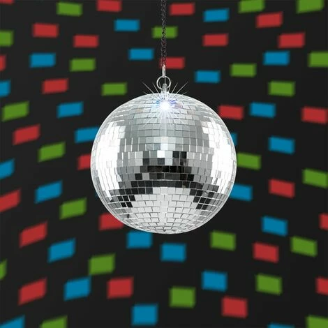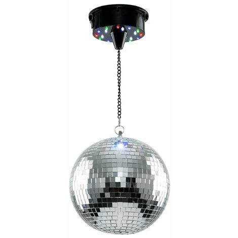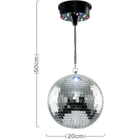 Battery operated rotating multi coloured LED disco ball ceiling light. Features 18 multi coloured LED lights which shine down on a 20cm mirror ball which is suspended by a chain from a motorised rotating ceiling hub. The mirror ball reflects the light around the room creating a multi coloured swirling pattern on walls and ceilings. Simply requires 3 x AA batteries (not supplied).