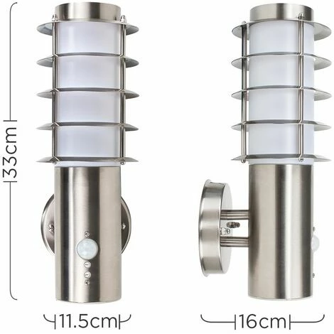 Modern outdoor wall lantern in a stainless steel finish. Features a contemporary design with a frosted white inner shade. Features contemporary design and high-quality weatherproof construction with a built in PIR motion sensor. An ideal product to help create a warm and inviting glow to doorways porches and external walls. IP44 rated – fully certified for outdoor installation.