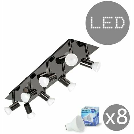 Stunning 8 way designer spotlight in a black chrome finish – rectangular plate design. This contemporary ceiling spotlight is ideal for lounges dining rooms kitchens bedrooms and other living areas within the home. Update your ceiling fittings with this beautiful and stylish light feature. The spotlight heads are adjustable and can be tilted to how you prefer them – simply direct and swivel the light to where it is required. Easy to install. 8 x Super Bright GU10 Energy Saving Warm White LED Bulbs Included