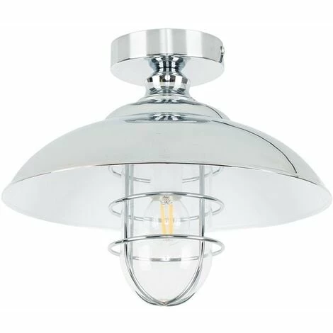 Fisherman’s lantern style ceiling light fitting in a silver chrome finish and a white interior featuring a wire basket shade. The bulb is encased in an open metal cage.