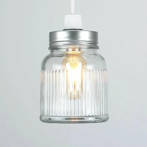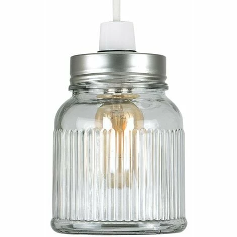 Retro style jar ceiling pendant light shade with a silver brushed chrome lid and clear textured ribbed pattern glass finish. Ideal for living rooms bedrooms dining rooms and hallways. Easily fits to a ceiling light socket – no electrical installation required. Ceiling lights are usually the main source of illuminating a room but with the many styles on offer today also become a main focal point or talking point. The right fitting can make a real style statement and complete your living space look. 1 x 40w BC B22 Bulb Is Required – Not Supplied.