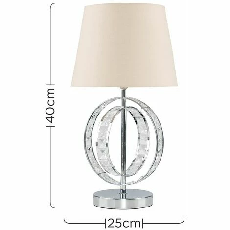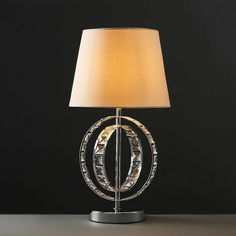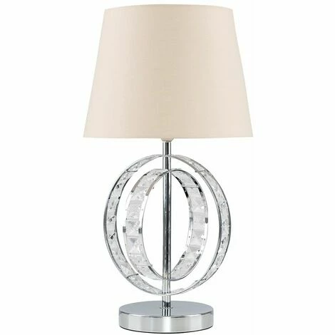 divModern metal table lamp in a polished chrome finish featuring a beautiful acrylic jewel effect intertwined double hoop design. Lamp comes complete with a beige fabric tapered shaped light shade. This light is a great focal point for any room in your home. Table lamps are a great way to bring additional lighting to a room or you can use them reduce your main light output and create a more relaxing mood/atmosphere. Please note this shade is flat packed and requires self assembly./div