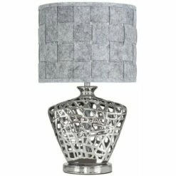 Contemporary lamp base featuring a beautiful lattice vase shaped design in a silver ceramic finish a grey felt weave design cylinder shade. This light is a great focal point -Ideal for use in lounges hallways bedrooms and other living areas. Please note this shade is flat packed and requires self assembly.