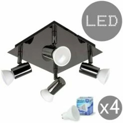 Modern adjustable 4 way square spotlight in a beautiful black chrome finish. This spotlight is suitable for ceiling mounting and is ideal for lounges dining rooms kitchens bedrooms and other living areas. Spotlights are a great way to bring additional illumination into a room. The adjustable heads enable you to direct the light source to exactly where you want it. 4 x Super Bright GU10 Energy Saving Cool White / Daylight LED Bulbs Included