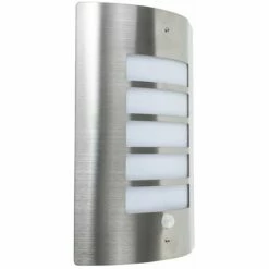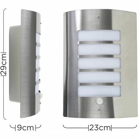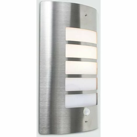 This stylish wall mounted outdoor light has a stunning modern silver stainless steel flush curved design and is ideal for lighting gardens paths garages patios courtyards decorative porches and driveways. IP44 outdoor weatherproof rated with numerous light-emitting frosted opal lenses providing extra security for the home and giving peace of mind. The wall-mounted outdoor flush light comes in a sturdy and weatherproof durable stainless steel design. Equipped with PIR motion detector / sensor. This robust illuminating external light is IP44 Rated and is fully certified for outdoor installation. 1 x 60w ES E27 GLS Bulb is Required – Not Supplied