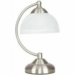 Contemporary style crescent shaped table lamp in a brushed chrome finish. Featuring a frosted glass domed shade. Ideal in the lounge bedroom or dining room.