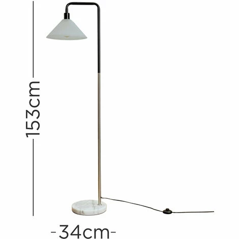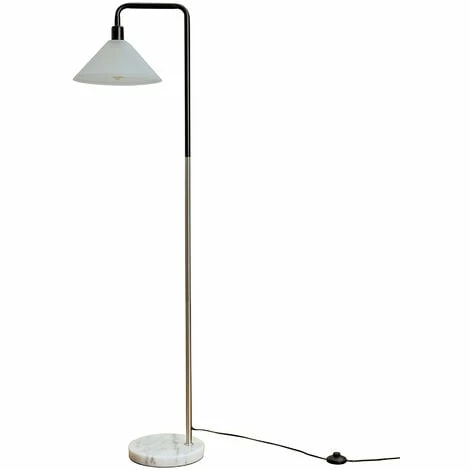Retro style metal rod frame floor lamp in a matt black and chrome finish with a white solid marble base. This lamp is constructed from high quality materials and the marble base makes this lamp extremely sturdy. This contemporary floor lamp is guaranteed to make a statement in any home. Complete with a white frosted glass tapered light shade.