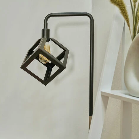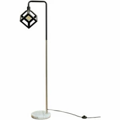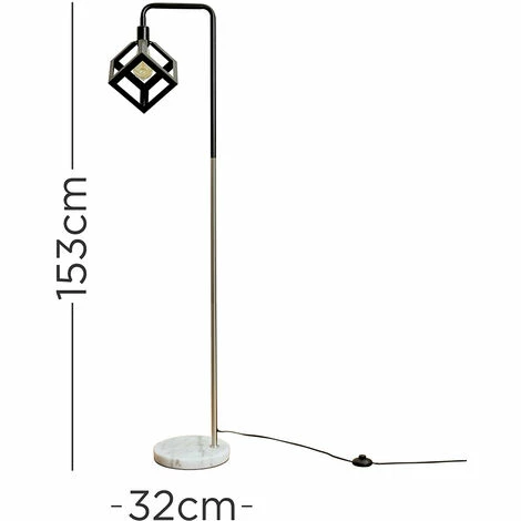 Retro style metal rod frame floor lamp in a matt black and chrome finish with a white solid marble base. This lamp is constructed from high quality materials and the marble base makes this lamp extremely sturdy. This contemporary floor lamp is guaranteed to make a statement in any home. Complete with a black metal puzzle cube design light shade that features an open design which allows the light to disperse effectively and evenly throughout the room.