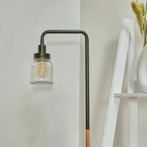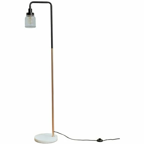 Retro style metal rod frame floor lamp in a matt black and copper finish with a white solid marble base. This lamp is constructed from high quality materials and the marble base makes this lamp extremely sturdy. This contemporary floor lamp is guaranteed to make a statement in any home. Complete with a clear glass ribbed design jar light shade.