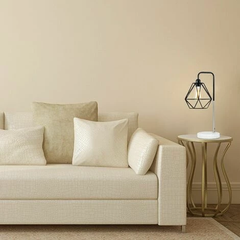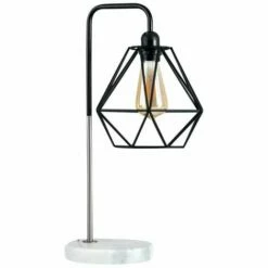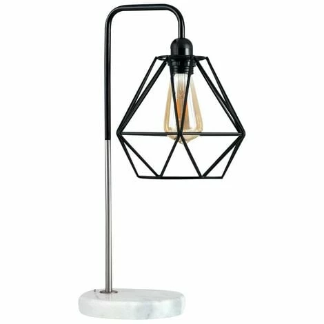 Retro style metal rod frame table lamp in a matt black and chrome finish with a white solid marble base. This lamp is constructed from high quality materials and the marble base makes this lamp extremely sturdy. This contemporary table lamp is guaranteed to make a statement in any home. Complete with a gloss black metal cage shade which features an open design which allows the light to disperse effectively and evenly throughout the room. Table lamps are a great way to bring additional lighting to a room – perfect for hallways bedrooms lounges living rooms and offices.