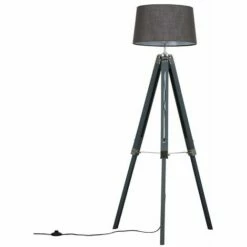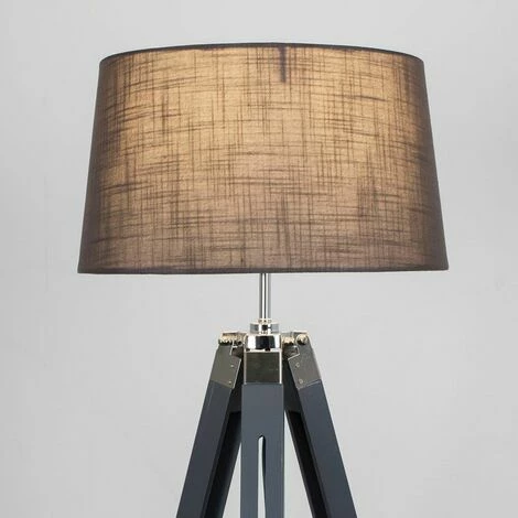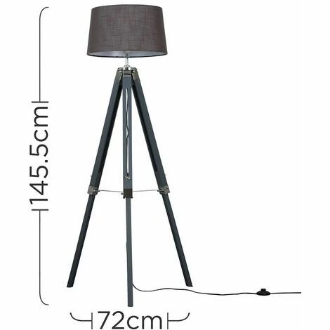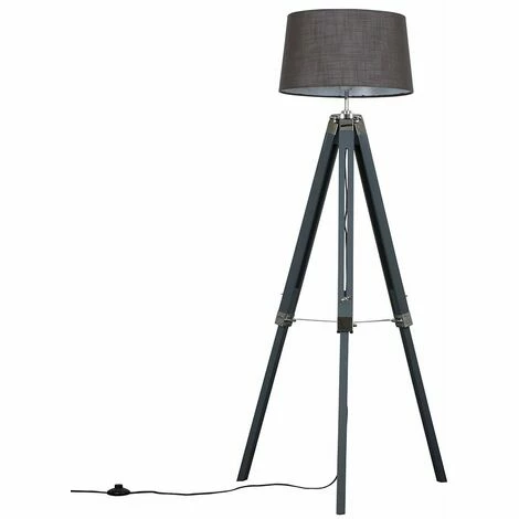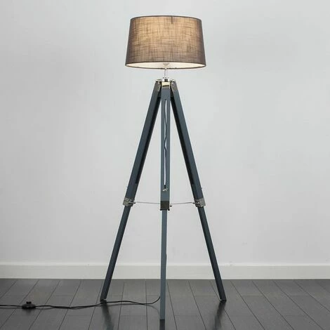 Modern tripod floor lamp in a grey wood effect & Chrome finish which features an in-line on/off switch for easy use. Comes complete + tapered shade in a dark grey faux linen fabric finish. An instant update you can change your room in seconds.