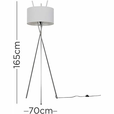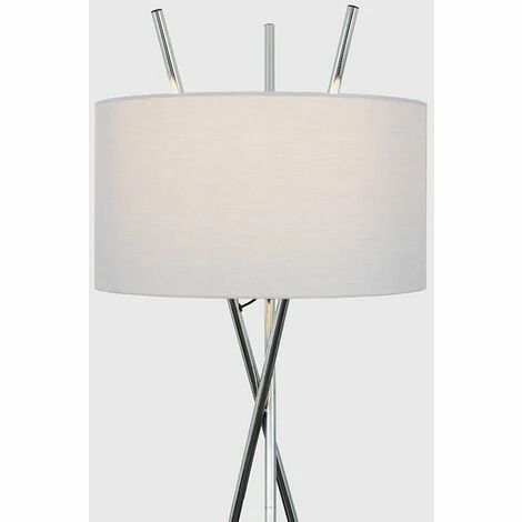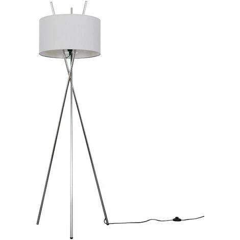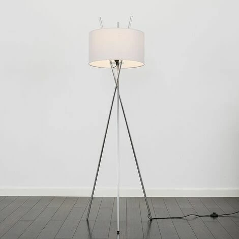 MiniSun crossover design tripod floor lamp in a polished chrome metal finish. Comes complete with an extra large pale grey fabric cylinder lamp shade and features an in-line on/off foot switch for easy use. Floor lamps are a great way to bring additional lighting to a room. Ideal for lounges hallways bedrooms and other areas around the home.