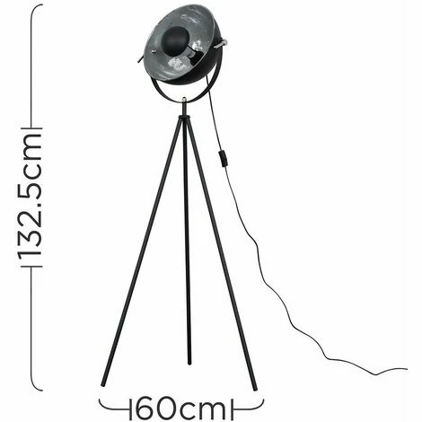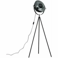 Retro style tripod floor lamp in a black metal finish which features a design inspired by photography lights creating a unique and stylish alternative to a traditional floor lamp. It has a contrasting silver interior which reflects light around the room and gives a beautiful ambient glow when the light is switched on. Features an in line on/off switch for ease of use.