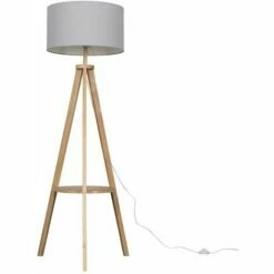 Modern tripod style floor lamp in a light brown painted wood finish complete with a grey fabric drum lamp shade and a shelf for convenient storage or to use as a decoration place. Features an in-line on/off foot switch for easy use. Floor lamps are a great way to bring additional lighting to a room or you can use them reduce your main light output and create a more relaxing mood/atmosphere.