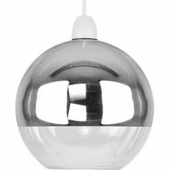 Modern ceiling pendant light shade in a stunning combination of clear and chrome effect glass. This superb light shade features an unusual two tone globe design. This looks great either on it own or in a series of two or more. Ideal for living rooms bedrooms dining rooms and hallways. Easily fits to a standard ceiling light socket – no electrical installation required. 1 x 40w BC B22 GLS Bulb Is Required – Not Supplied