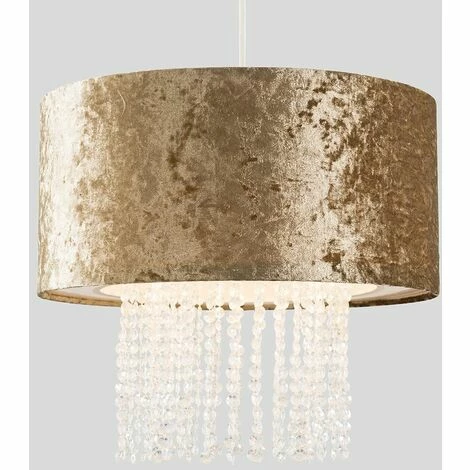 Modern cylinder ceiling pendant light shade in a gold velvet finish which features clear acrylic jewel droplets which cast subtle patterns around the room when lit. Ideal for lounges dining rooms bedrooms hallways and other areas around the home. Easily fits to your existing ceiling lampholder – no electrician required. Ceiling lights are usually the main light source in a room. The right fitting can create a statement and complete your living space look.