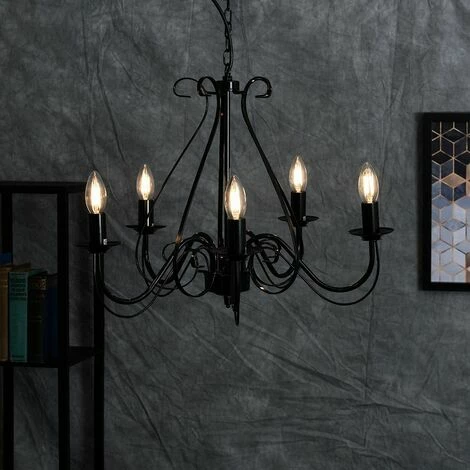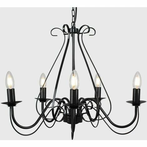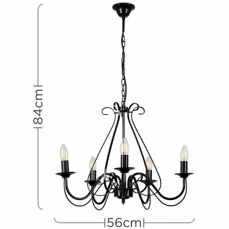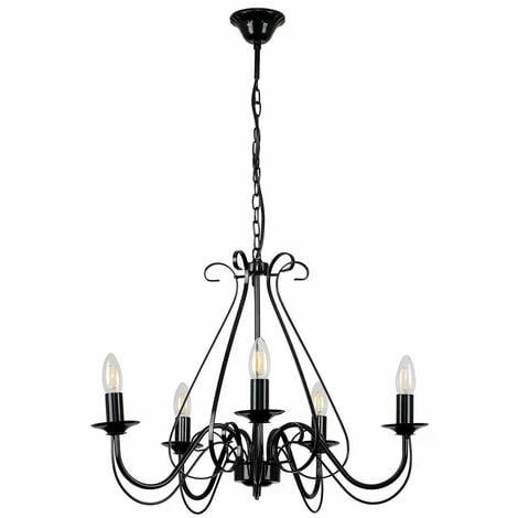 Large 5 way ceiling light chandelier in gloss black finish. Featuring decorative curled details and attachments this light fitting will look great in any home.