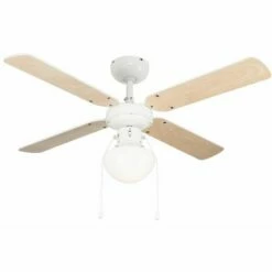 Modern MiniSun branded four blade three speed ceiling fan in a contemporary white finish. Features reversible blades in white or beech effect finish. Includes an integrated ceiling light with on / off pull switch. Ideal for most rooms this ceiling fan has a directional motor so it can be used in both warm and cold conditions. Comes complete with a full function remote control product guide and installation instructions. Please NOTE the remote control is not suitable for use with LED bulbs. Please Note – Not suitable for use with LED bulbs