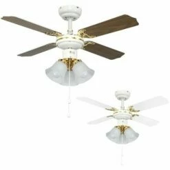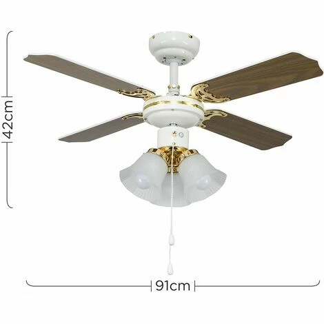 Modern MiniSun branded four blade three speed ceiling fan in a brass effect and white finish. Features reversible blades in white or oak effect finish. Includes an integrated three way ceiling light with frosted glass shades. Ideal for most rooms this ceiling fan has a directional motor so it can be used in both warm and cold conditions. Comes complete with full product guide and installation instructions. 3 x 4w LED SES E14 Warm White Golfball Bulbs Included