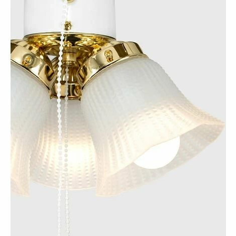 Modern MiniSun branded four blade three speed ceiling fan in a brass effect and white finish. Features reversible blades in white or oak effect finish. Includes an integrated three way ceiling light with frosted glass shades. Ideal for most rooms this ceiling fan has a directional motor so it can be used in both warm and cold conditions. Comes complete with a full function remote control product guide and installation instructions. Please NOTE the remote control is not suitable for use with LED bulbs.